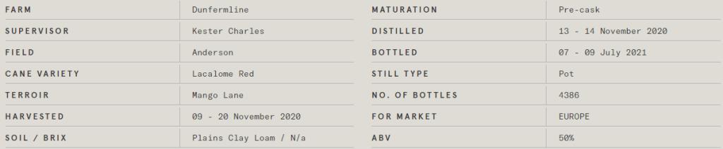 Renegade Dunfermline Pot Still 2021 (50%): The cane variety used for these Dunfermlines is Lacolme Red (or B80689), named after the area where it has been planted first and its reddish to brownish colour. It is said to be high in yield and sucrose content, with a great drought tolerance. Nose: Very fat “dirty” and umami. Olives, dried tomatoes, figs or dates, fresh soil and brine are my first associations, followed by more subtle, slightly sweeter notes such as plum juice or dry caramel. This one does it for me. Palate: Thick and creamy with those same umami notes that we’ve also found in the nose, mostly olives, dried tomatoes and the heavy fruits. With the second sip also bell peppers, grass and seasoned beef. Finish: Medium long and still meaty with brine, tomatoes, plums and caramel/ toffee. Very good and distinct. Much closer to Guadeloupe than to Martinique if you want. It is amazing how different this is from the New Bacolet, which uses the same cane variety.
